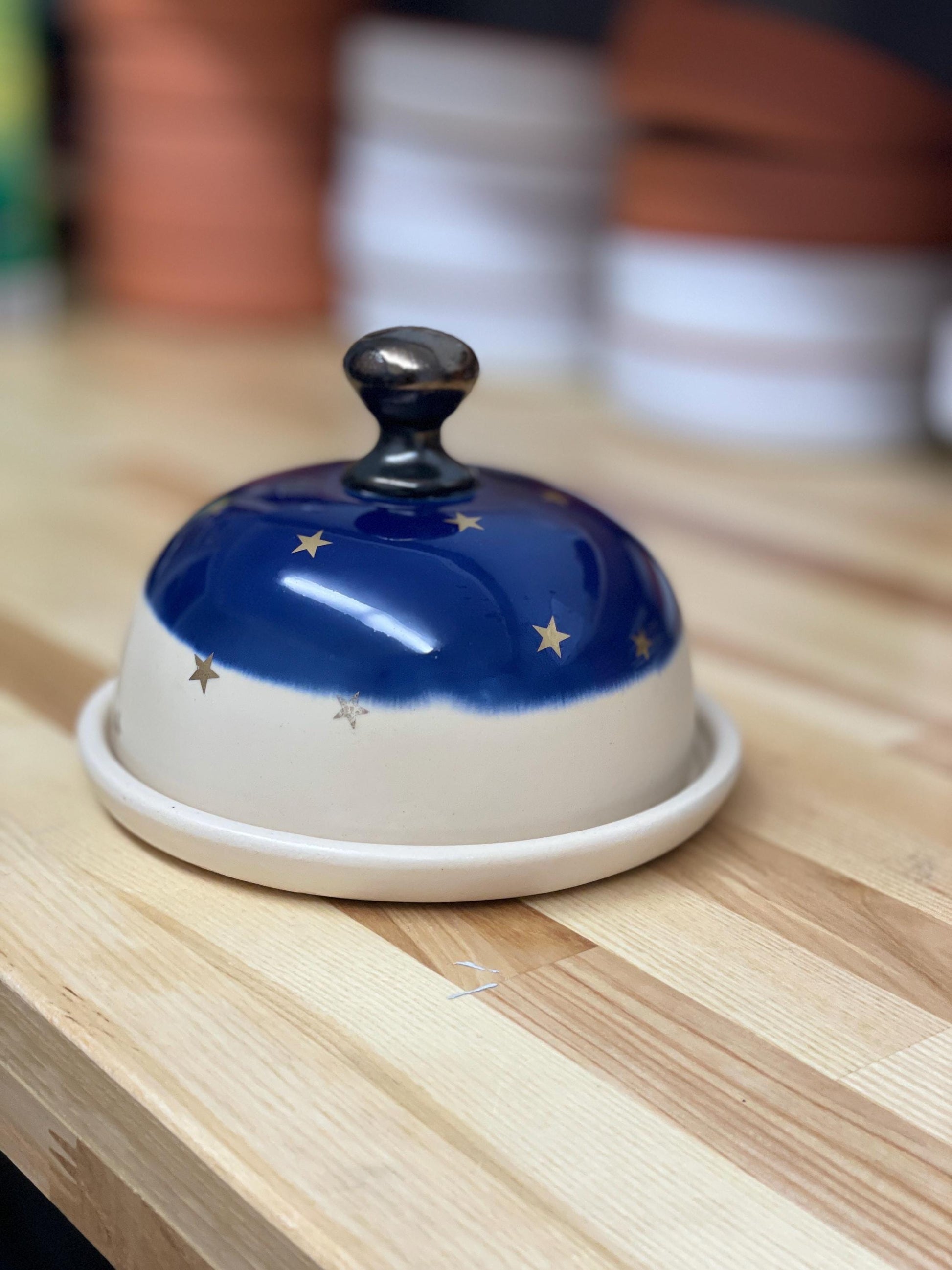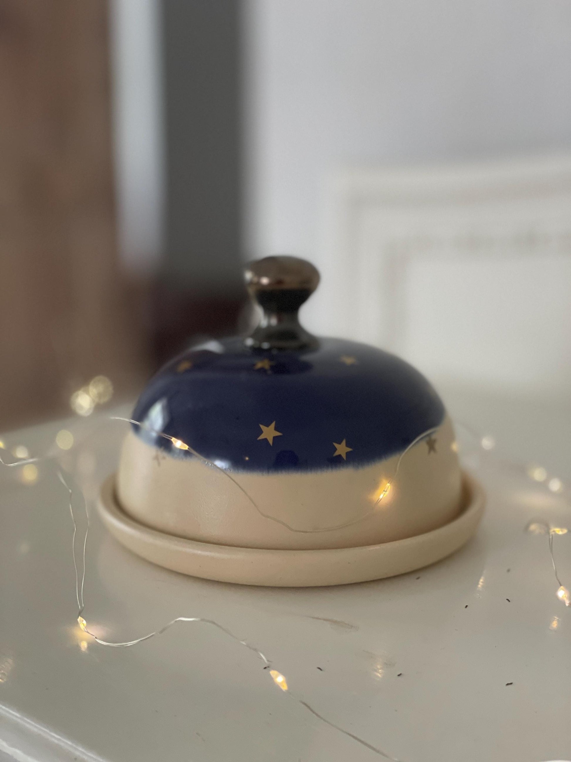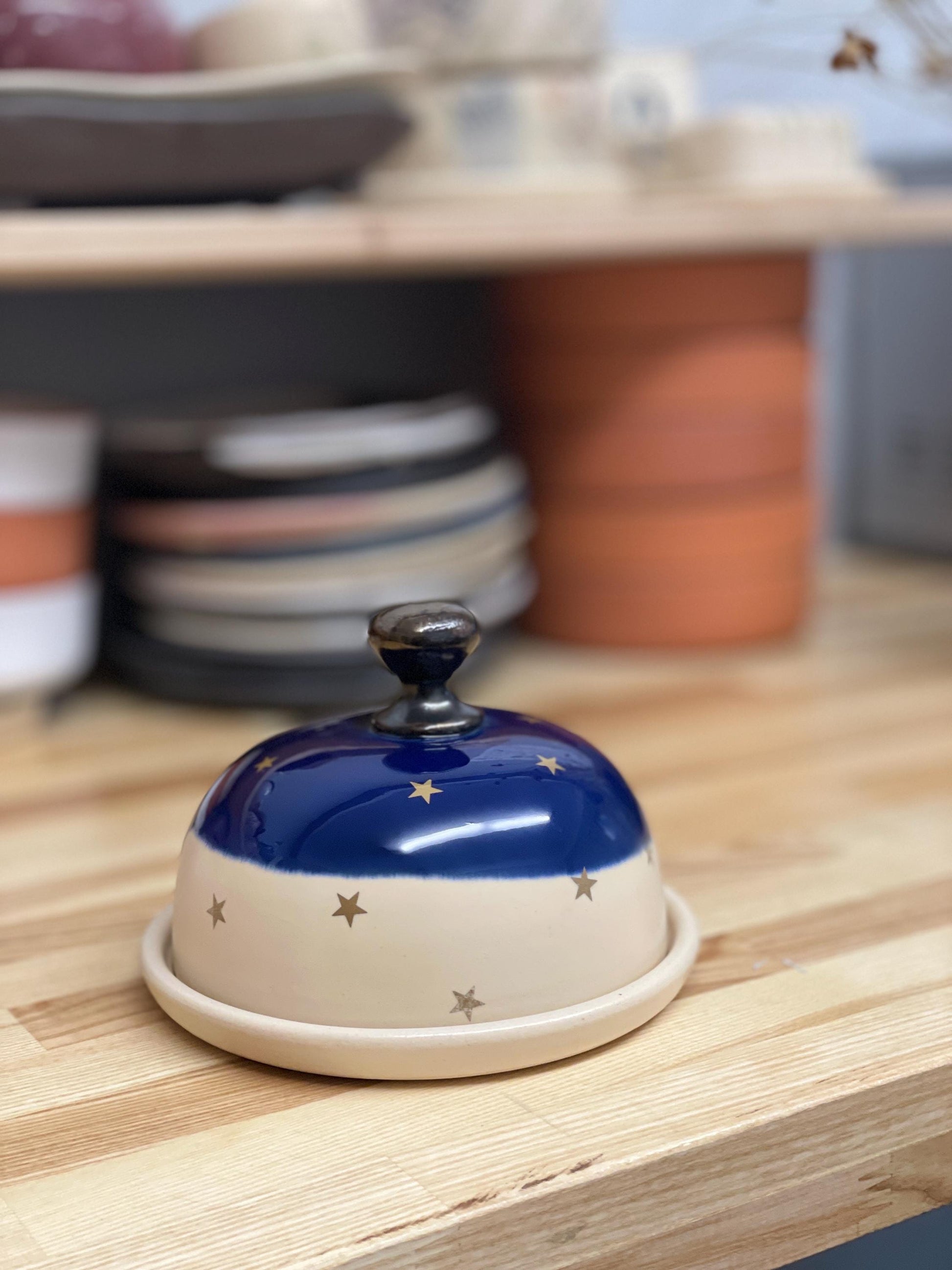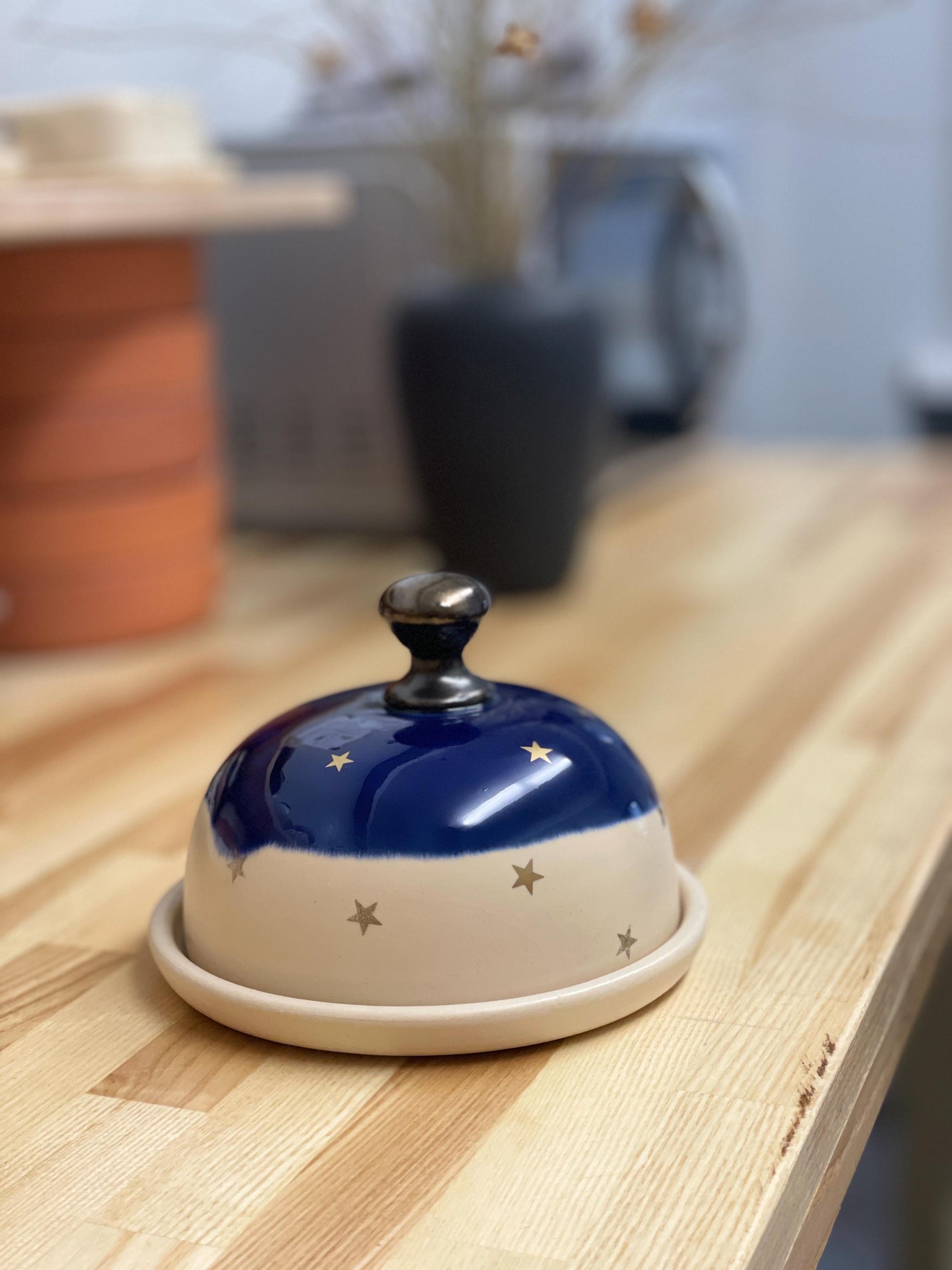 Klasiskais sviesta trauks ar paceļamu vāciņu. Der mūsu standarta sviesta izmēram, bet lieliski noder arī sieram.