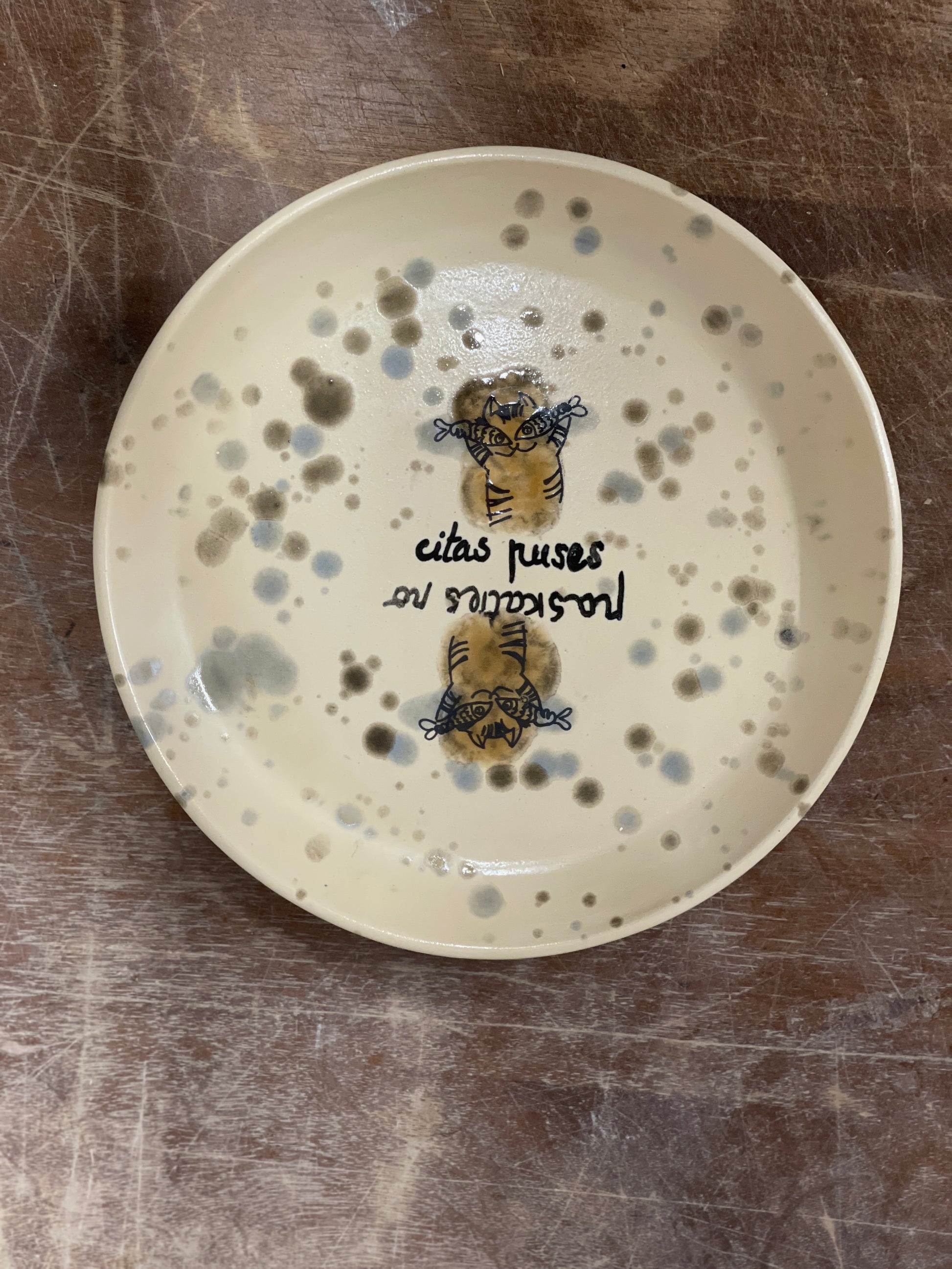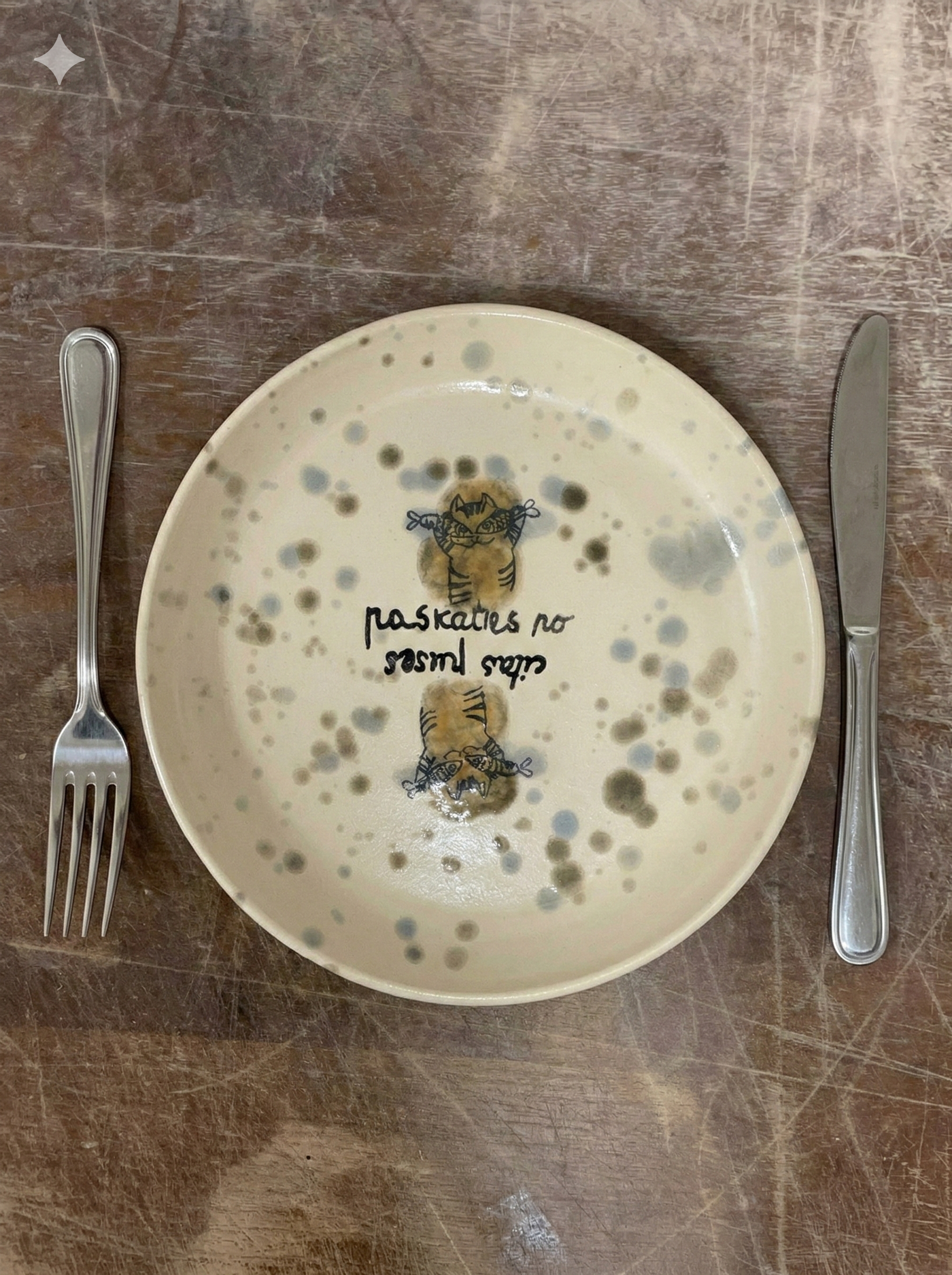 Man bija tāda kartiņa, - uzdāvināja ar tādu kaķi - Ieva no blakus keramikas darbnīcas. Un tā kartiņa gadus 20 karājās man vecajā darbnicā. Pārvacoties tā kaut kur nozaudējās...