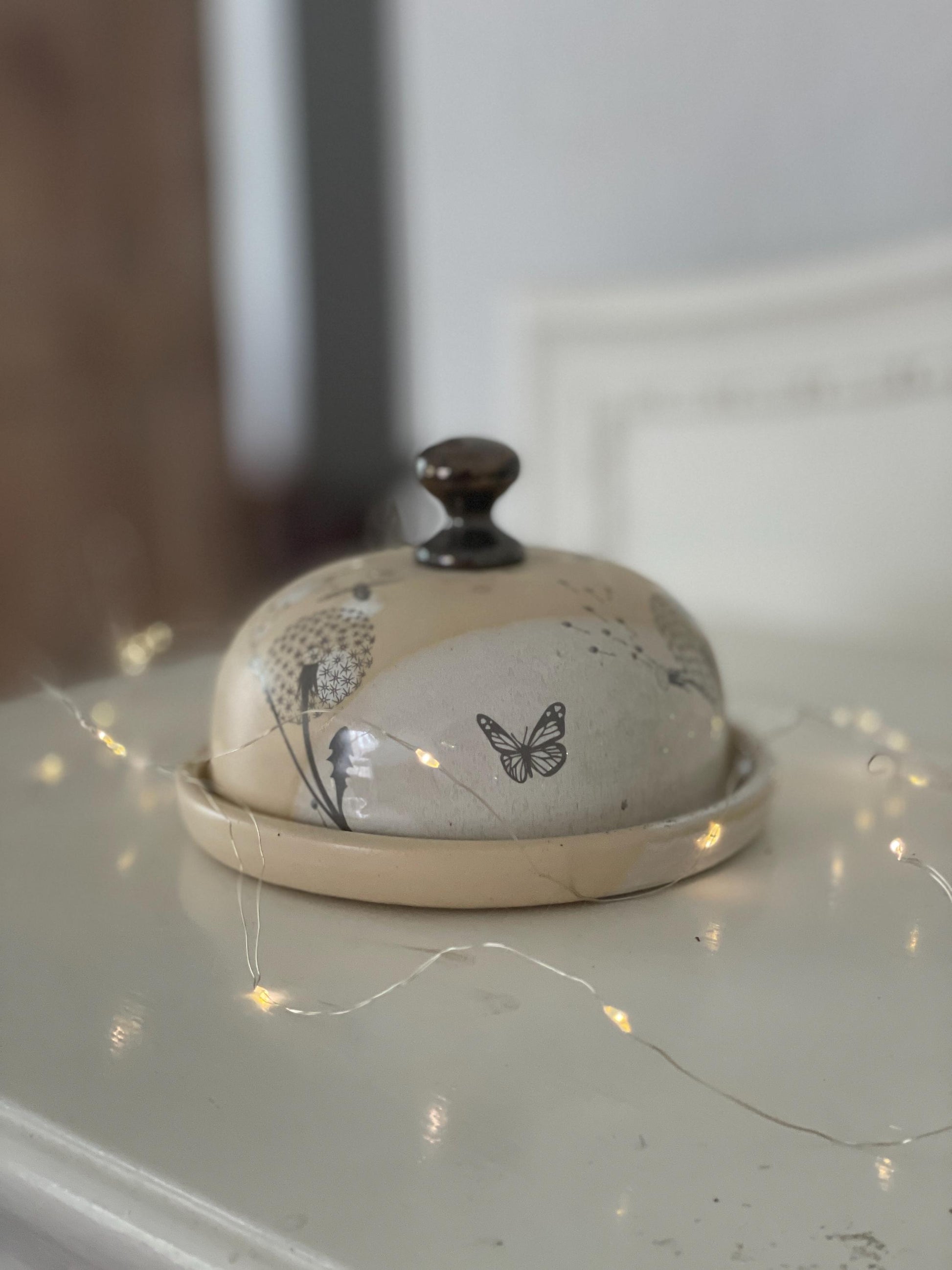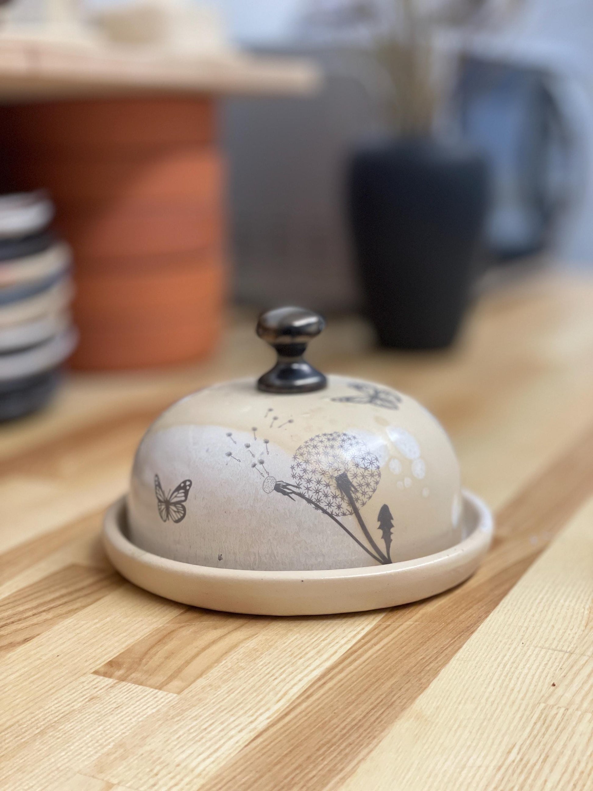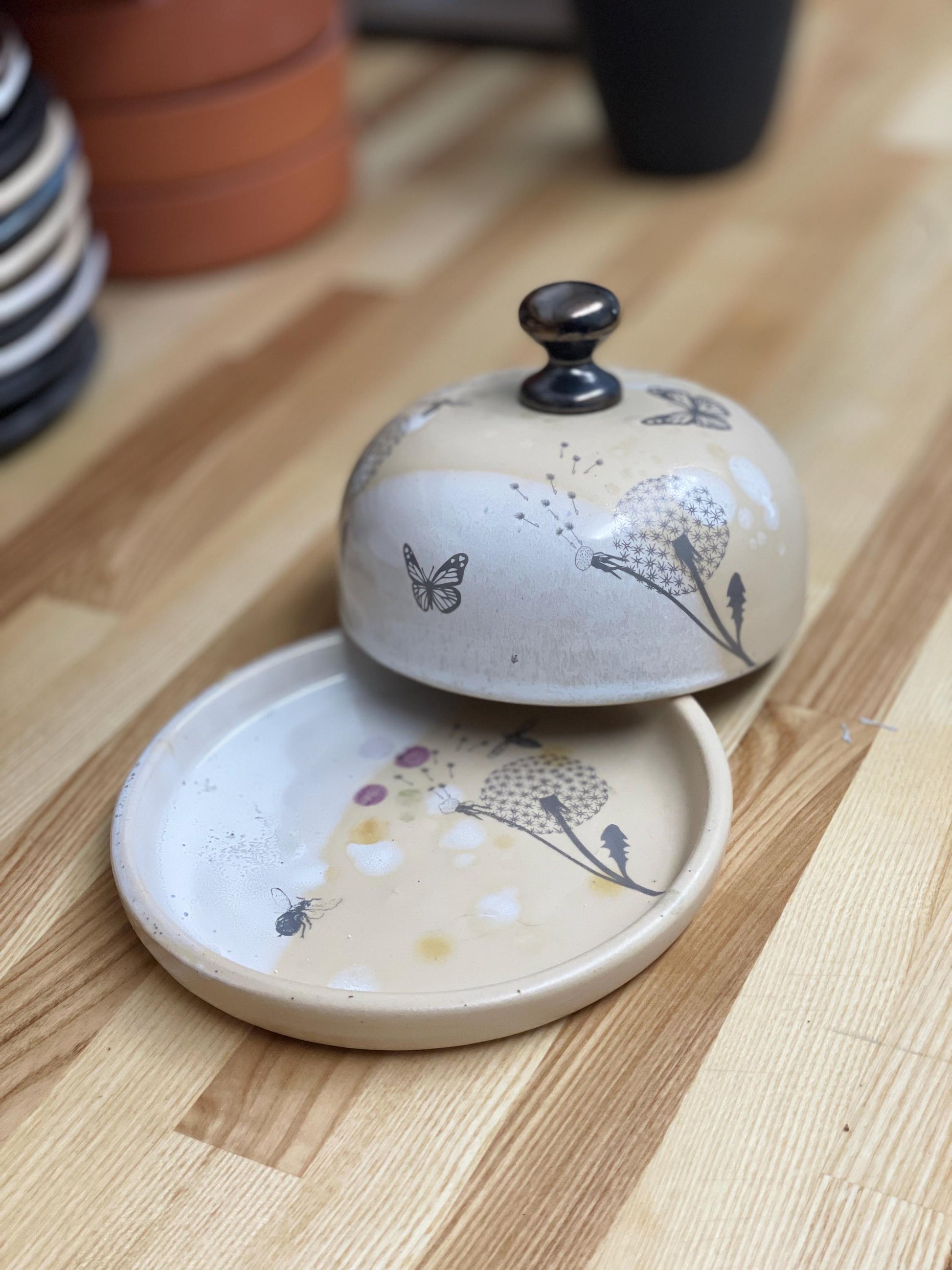 Klasiskais sviesta trauks ar paceļamu vāciņu. Der mūsu standarta sviesta izmēram, bet lieliski noder arī sieram.
