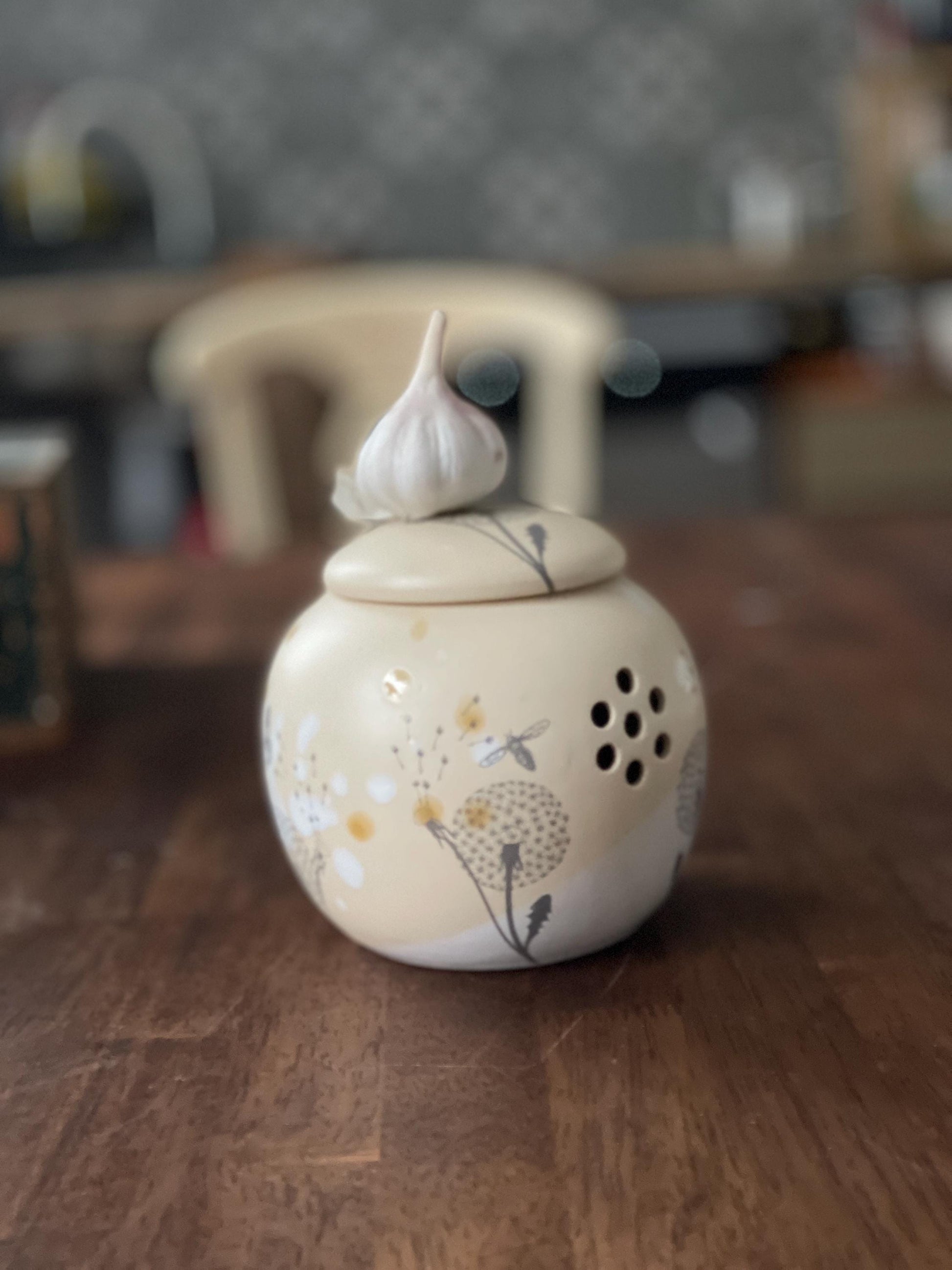 Tu zināji, ka ķiplokus nedrīkst likt ledusskapī? Tie paliek mitri un sapelē. Arī vienkārši ārā to glabāt ir grūti – tie izžūst. Tāpēc jāliek podā. Vispār jau vislabāk ir neglazētā podā. Bet ir labi arī šādā — tur ir caurumiņi, pa kuriem ventilējas gaiss. Liels pods.