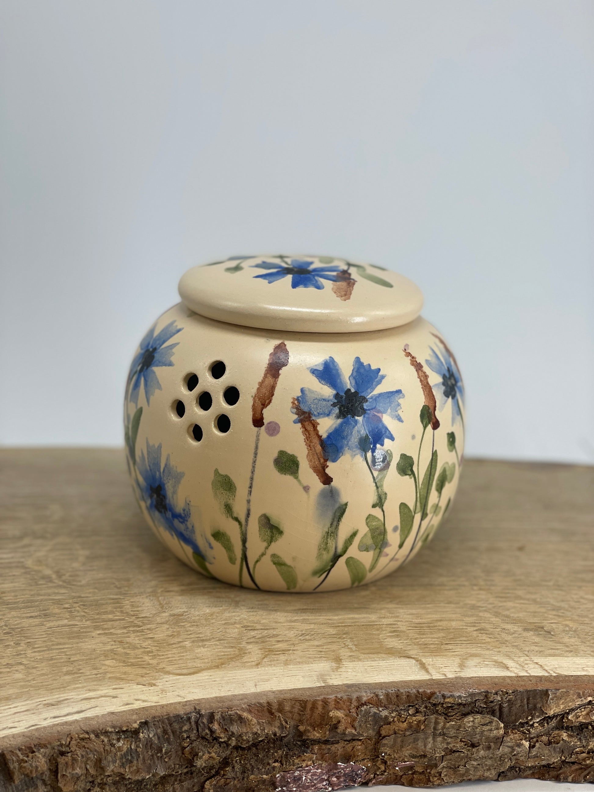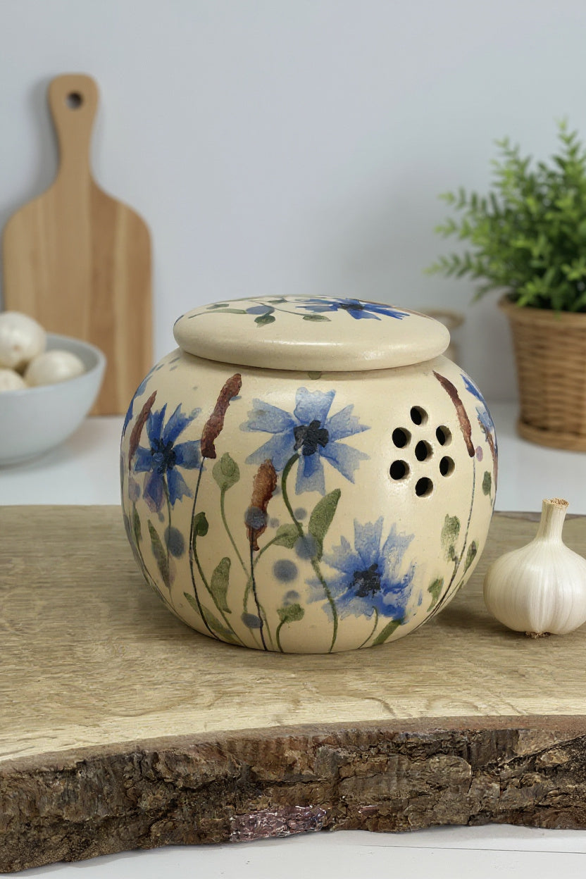 Tu zināji, ka ķiplokus nedrīkst likt ledusskapī? Tie paliek mitri un sapelē. Arī vienkārši ārā to glabāt ir grūti – tie izžūst. Tāpēc jāliek podā. Vispār jau vislabāk ir neglazētā podā. Bet ir labi arī šādā — tur ir caurumiņi, pa kuriem ventilējas gaiss. Liels pods.