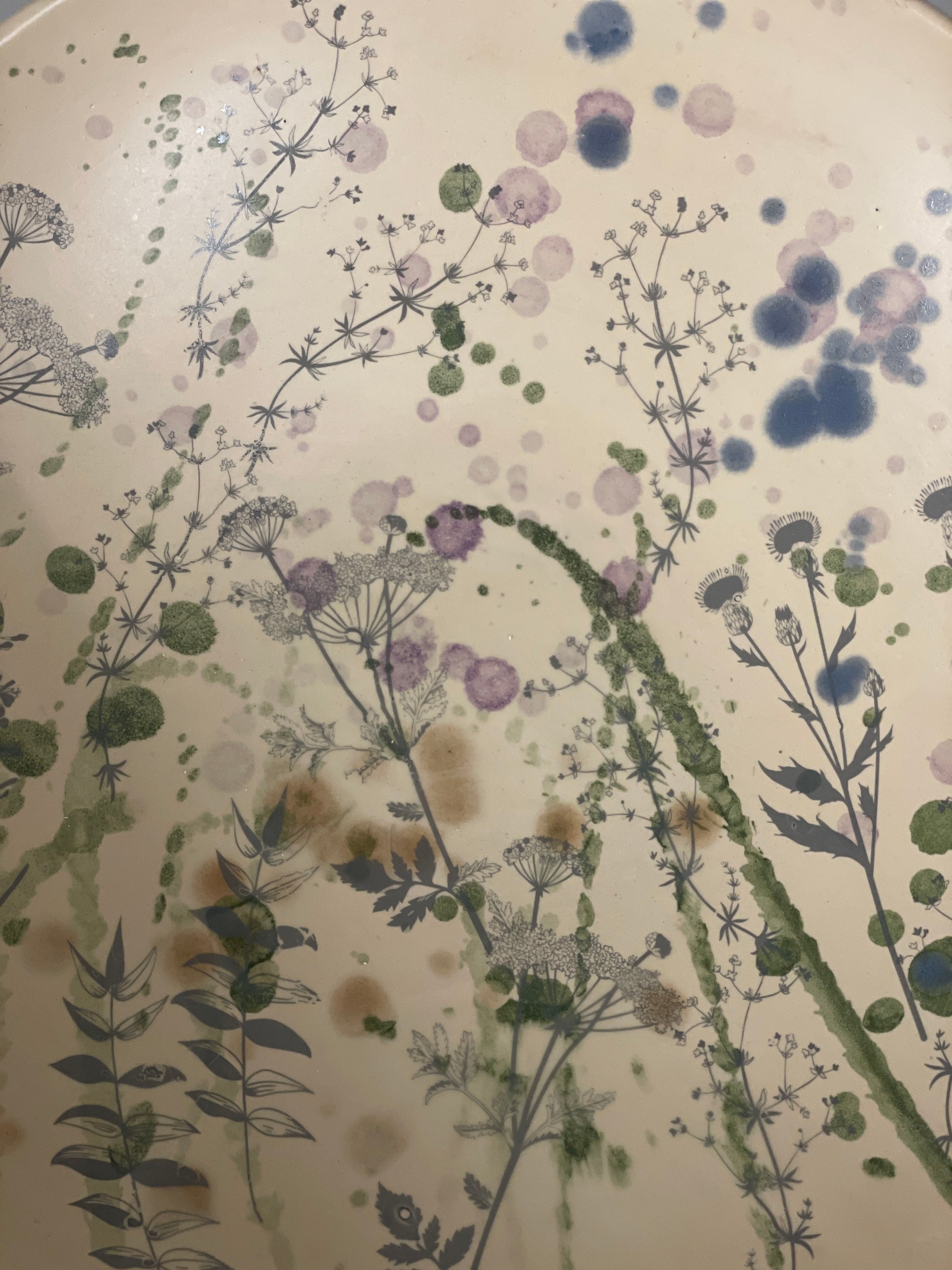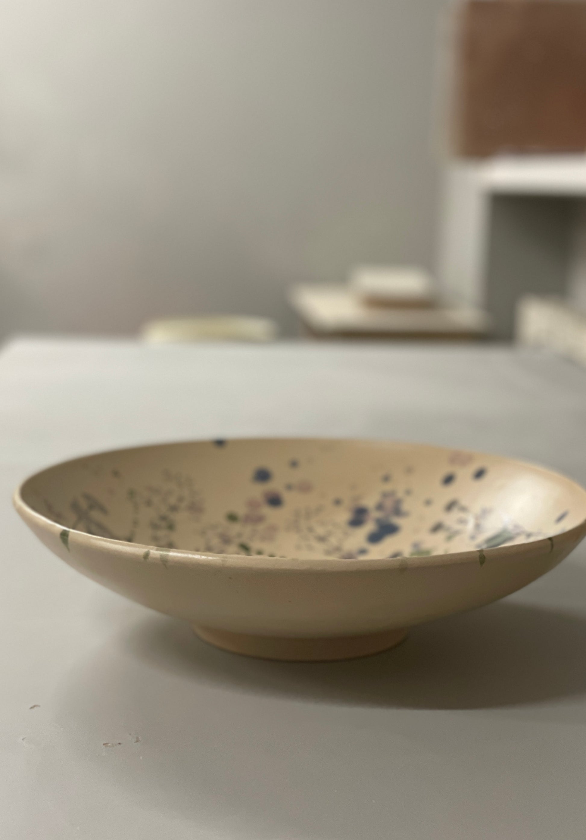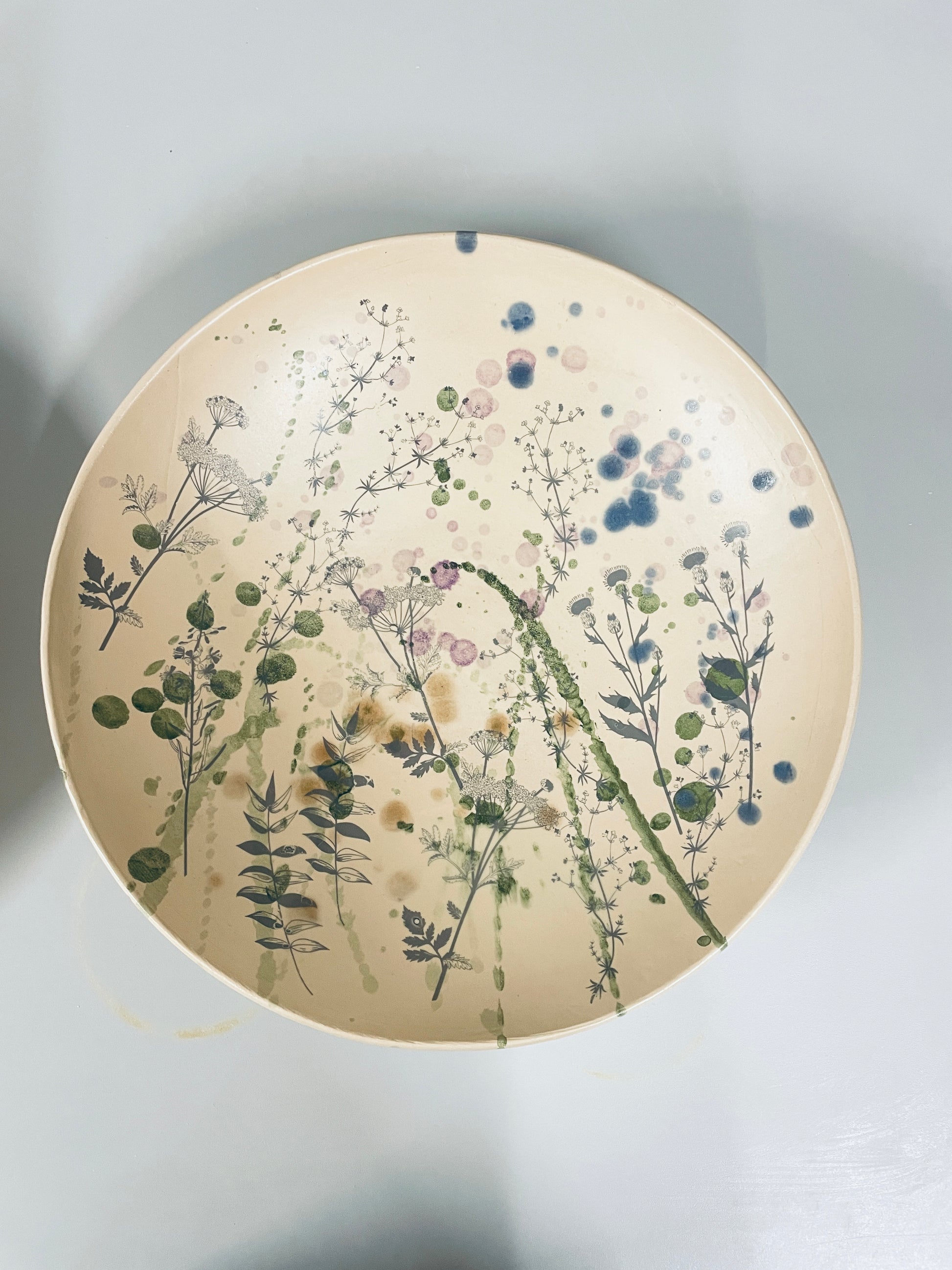Šķīvis ir pietiekoši dziļš, lai to lietotu kā bļodu salātiem. Rokas apgleznojums kas atgādina akvareli.