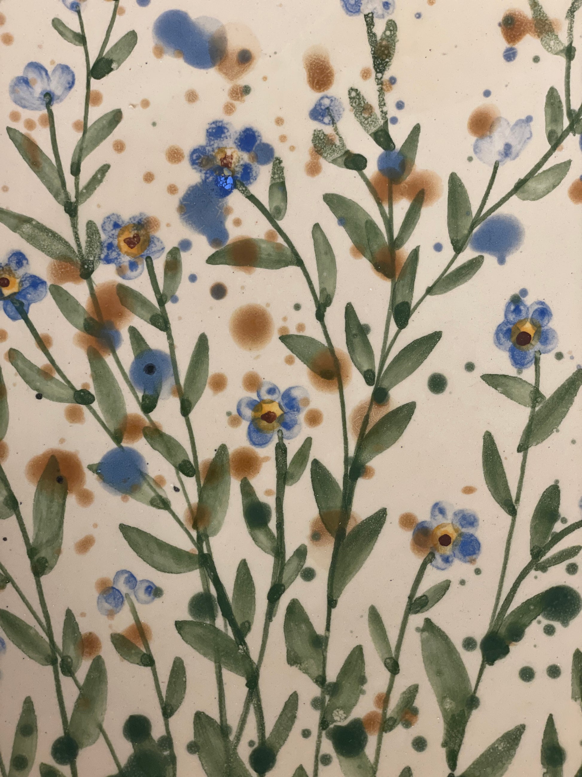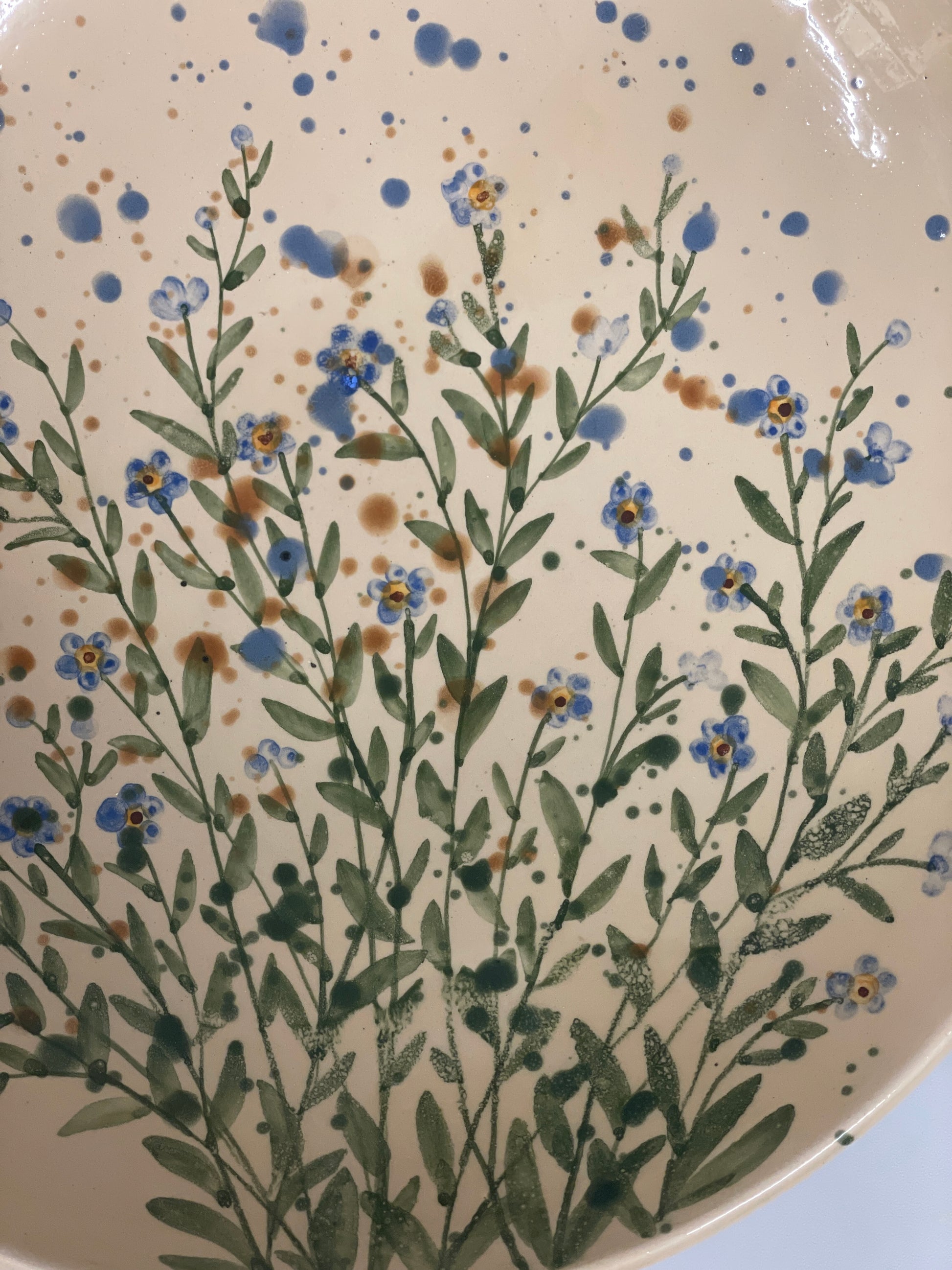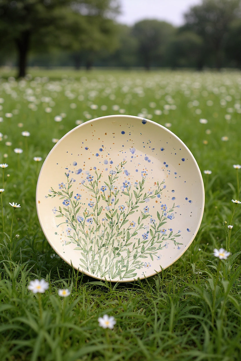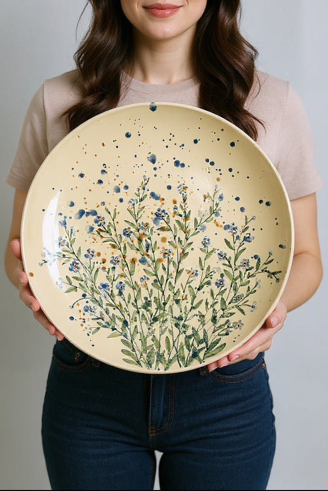 Šķīvis ir pietiekoši dziļš, lai to lietotu kā bļodu salātiem. Rokas apgleznojums kas atgādina akvareli.