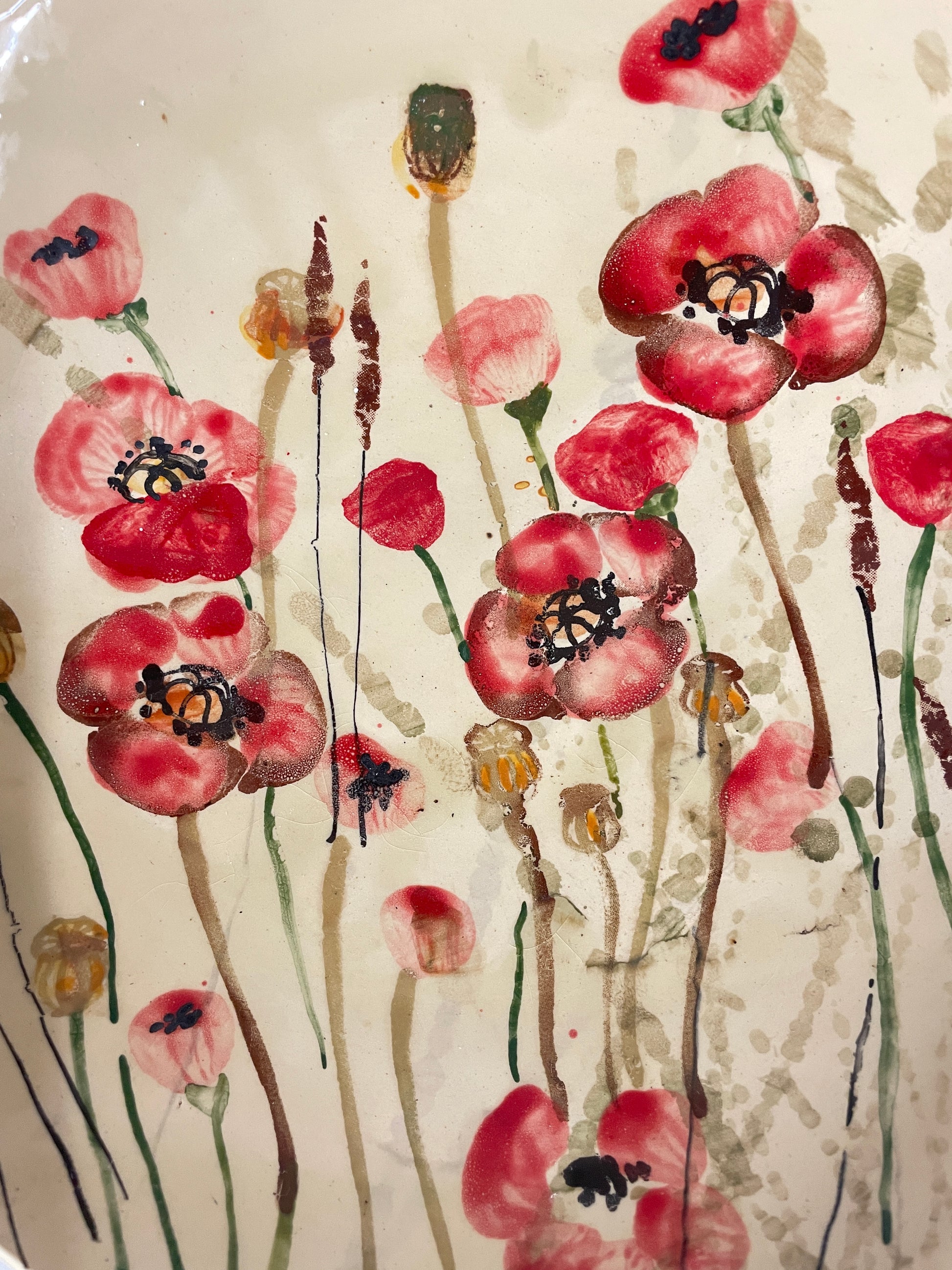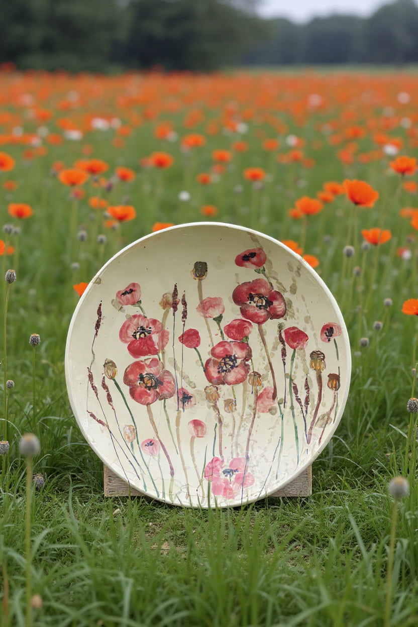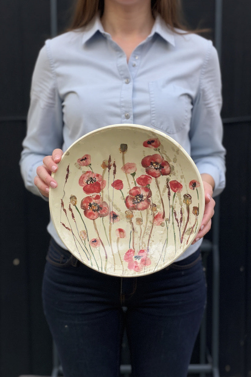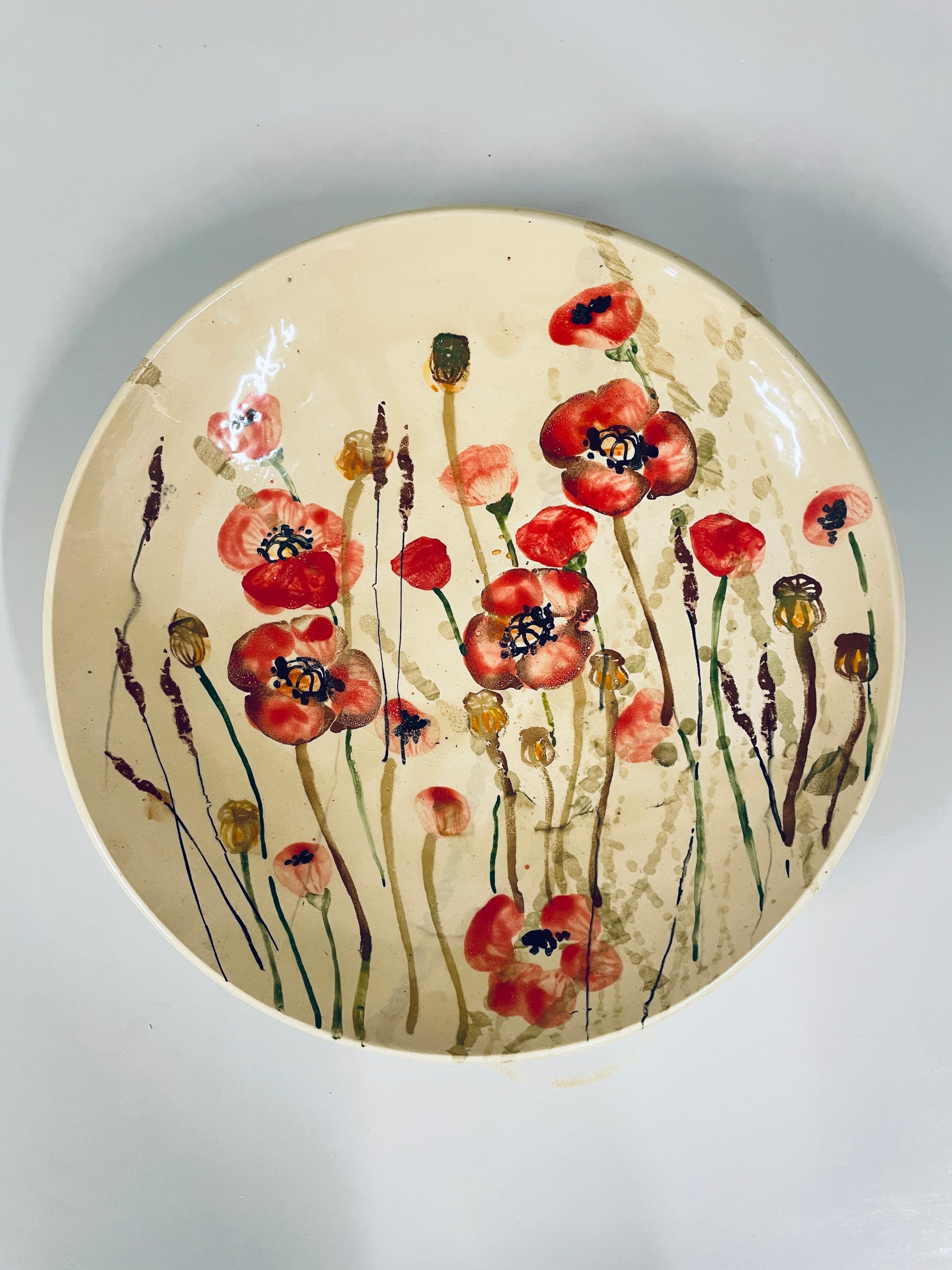 Šķīvis ir pietiekoši dziļš, lai to lietotu kā bļodu salātiem. Rokas apgleznojums kas atgādina akvareli.