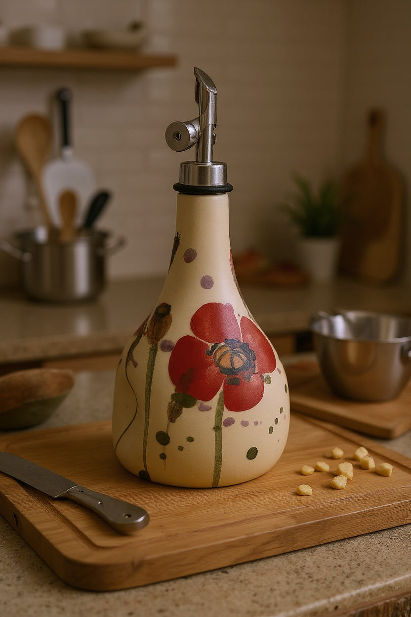 Tu droši vien esi dzirdējis, ka eļļa jāuzglabā tumšā traukā — citādi tā var oksidēties un kļūt rūgta. Šim eļļas traukam ir īpaši ērts satvēriens un lielisks dozators.