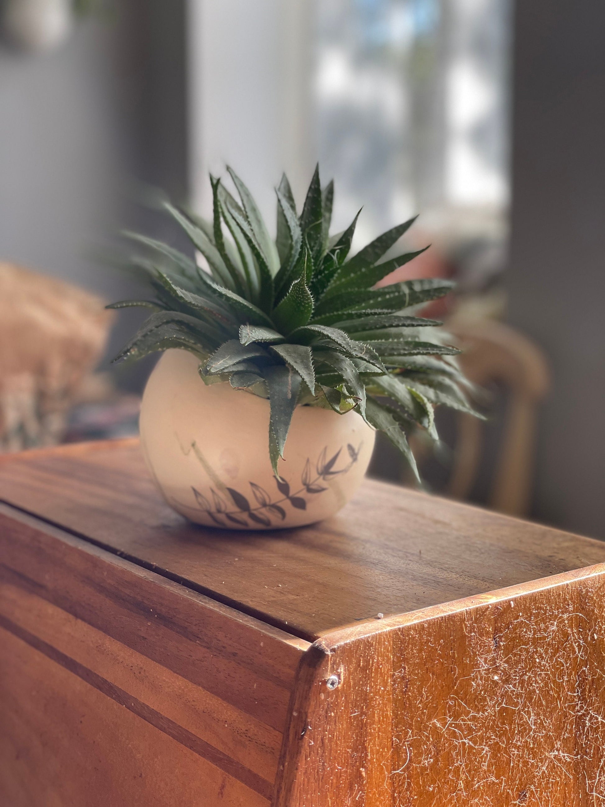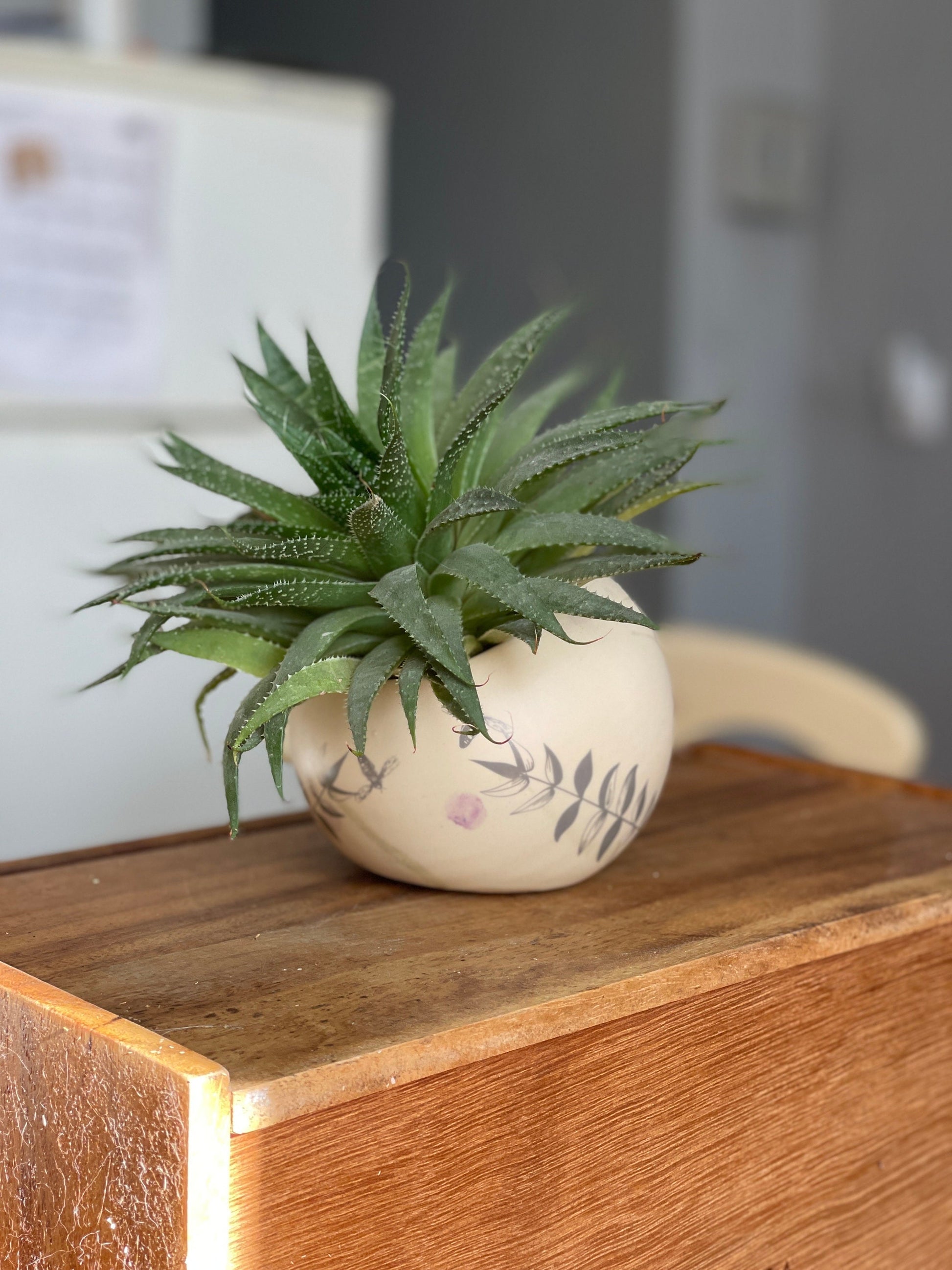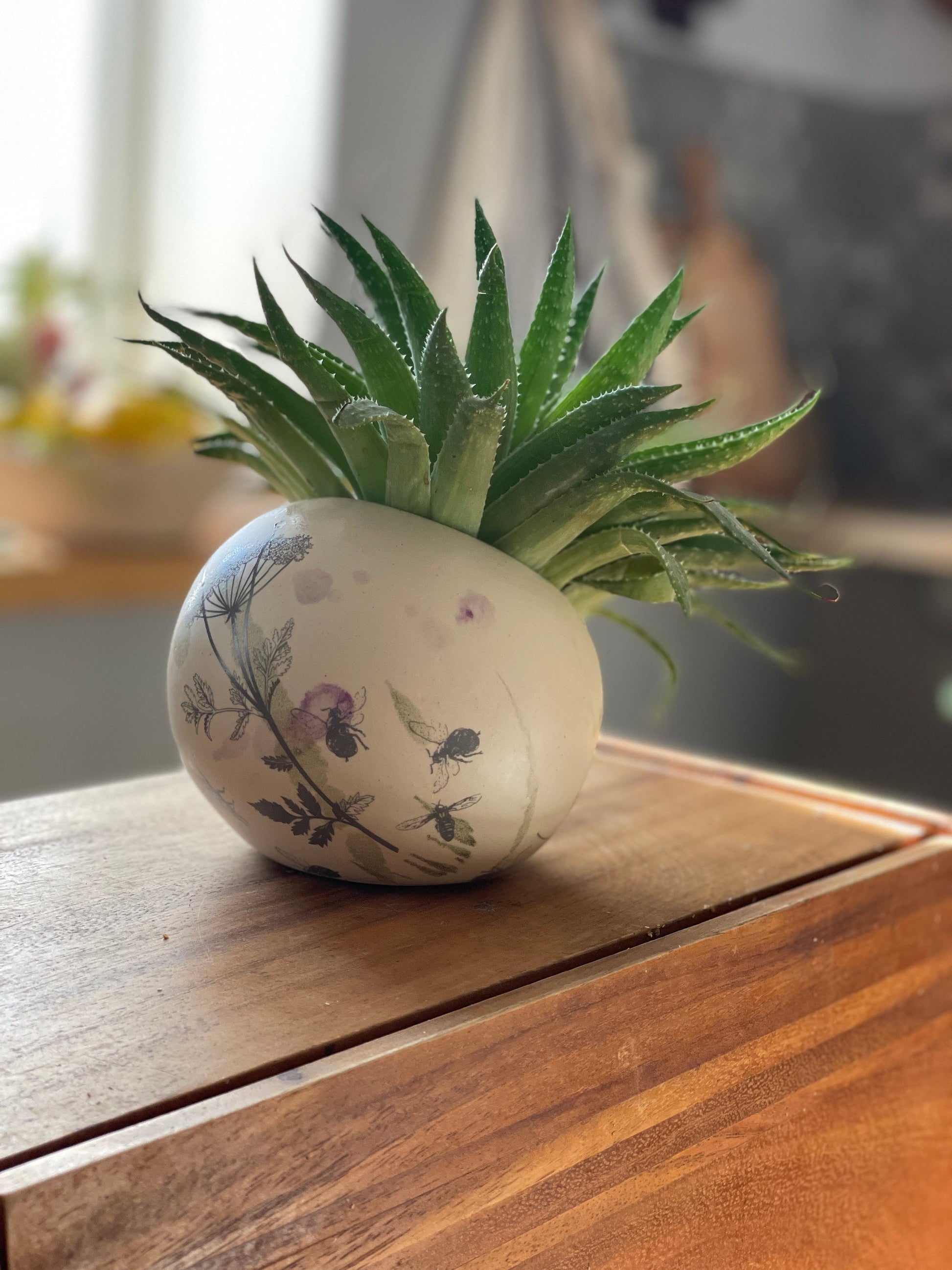 Es tādos lieku sukulentus. Izskatās tik stilīgi. Tikai podā nav cauruma, tāpēc ir nepieciešams labs drenāžas slānis vai iekšējais podiņš.
